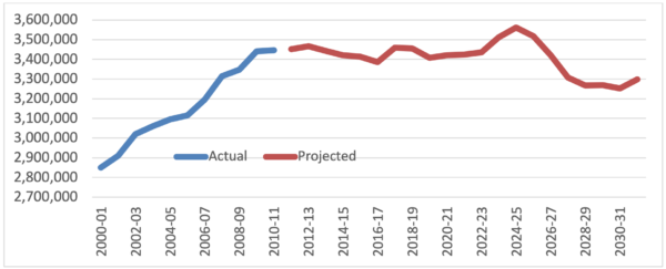 By looking at a longer time period than the first figure, it is apparent that the increases in high school graduates were dramatic from the late 1990’s to the early 2000’s. Even more important is the observation that NCHEMS Vice President Brian Prescott made, that not only were many higher education policies set in stone during that time, it is when most postsecondary leaders came into the field. They learned how to manage campuses and state systems at a time when access was the major issue. Very few have training for or experience with accommodating the new realities. They are now challenged to lead mature institutions [iii] that need to focus less on providing more access to recent high school graduates and more on serving a different set of students very well. In addition to the changes in the ways new traditionally aged students use and regard technologies, these mature institutions must adapt their practices for students of different income levels, preparation, ethnicities and ages. The observation above regarding leaders also applies to faculty members, most of whom are still focusing on bringing more students into their academic programs that can translate to more resources for their departments. Rarely is there any interest in downsizing academic programs.
