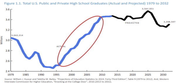 As the graph below shows (from WICHE’s 2016 Knocking at the College Door [i]), in nine years, the number of high school graduates in the U.S. will hit a low point in most states. These young people are already in elementary school, so this is not a prediction but a reality. That means there will be hundreds of thousands fewer high school graduates seeking college and university education. There are no indications these numbers will radically change beyond 2019.