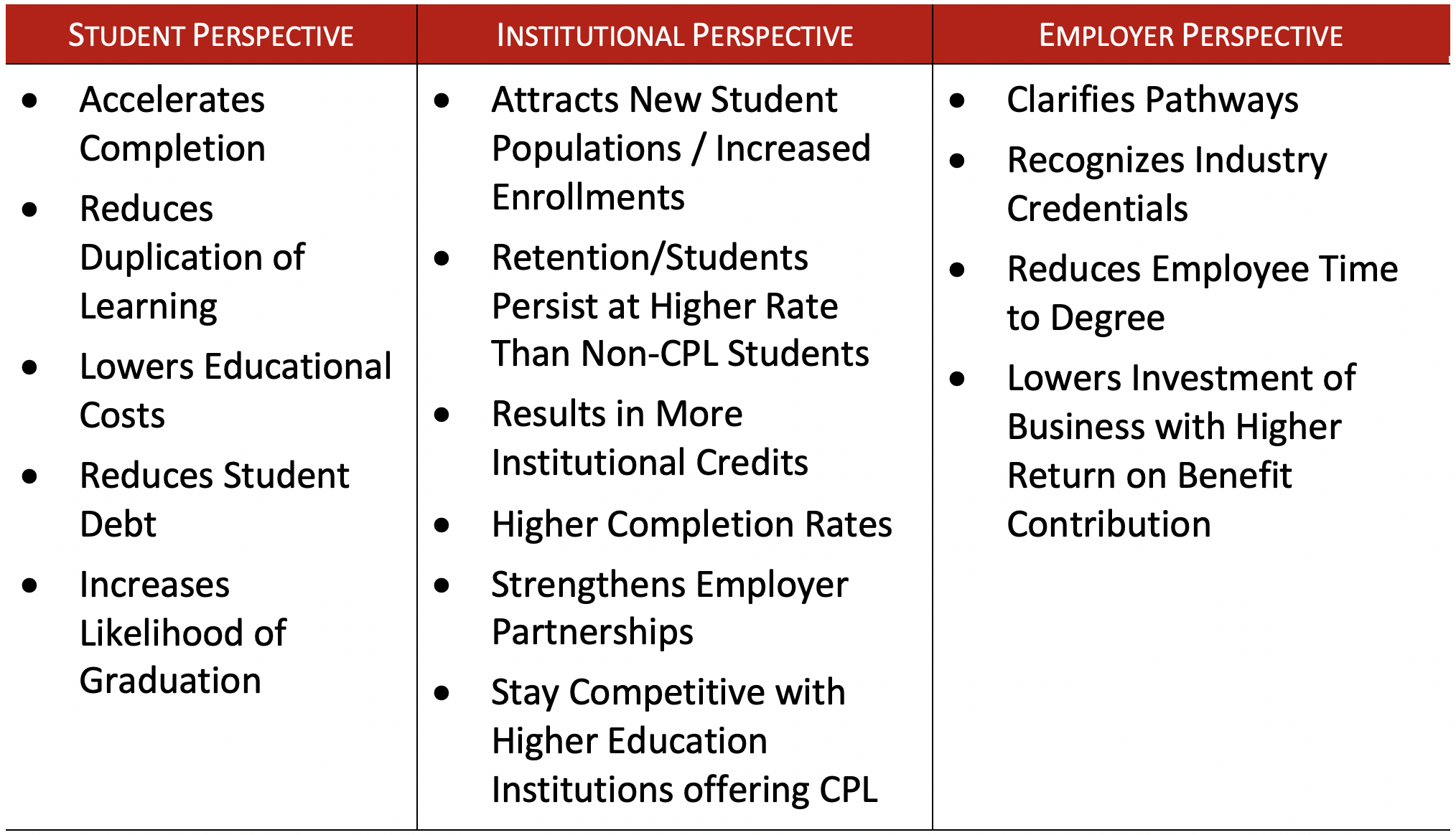 With technology advancements, more of today’s jobs require some form of postsecondary education. Thus, higher education is experiencing pressure for improved rates of degree completion from policymakers, accreditors, foundations and businesses. Credit for Prior Learning (CPL) is an innovative approach to address the skills gap by increasing degree completion through recognition of prior college-level learning.