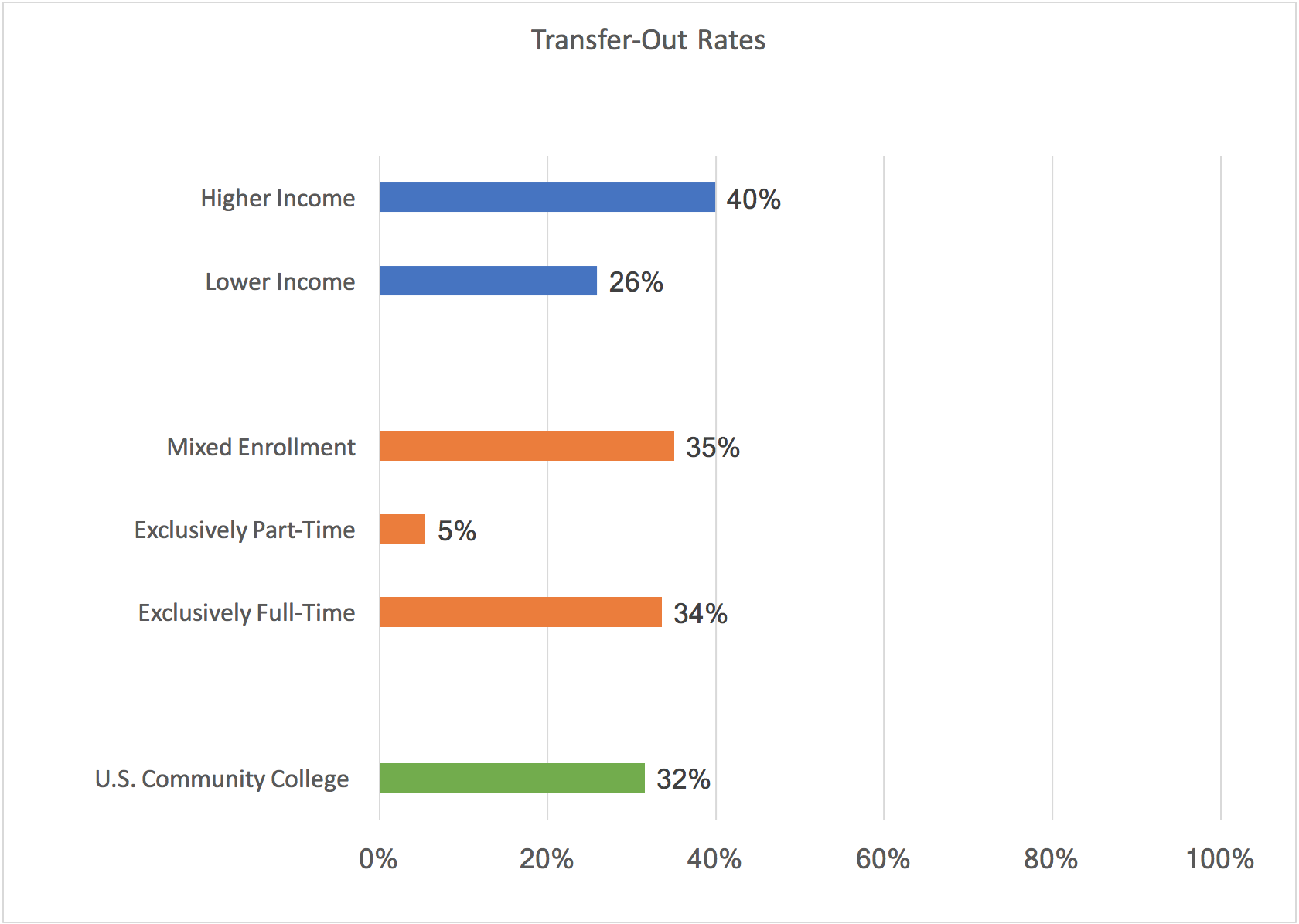 Students attending community colleges serving communities with lower socio-economic status (SES) were less likely to transfer to a four-year institution than students attending higher SES-serving community colleges (26.3 percent and 34.6 percent, respectively).