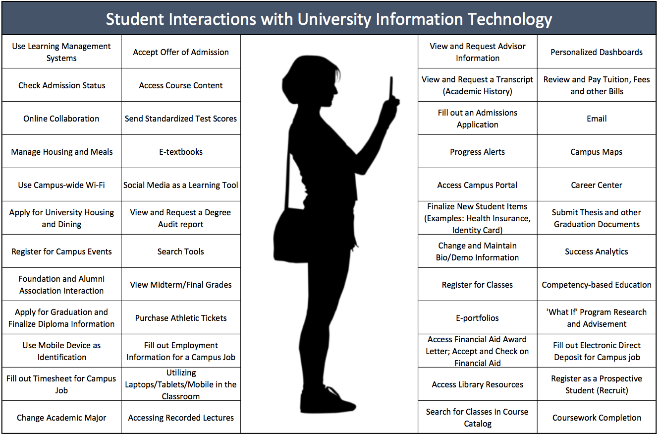 The diagram shows some of the interactions that a student has with the university. Time and time again, students want these interactions simplified. There are already some vendors that sell integration and aggregation platforms that simplify the processes. Nonetheless, it is rare that a student experience would include useful analytics about their current progress and their future job prospects in addition to easy ways to complete the numerous transactions. This is the goal, though.
