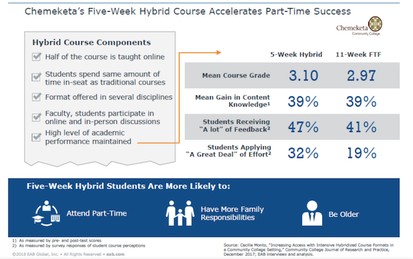 That said, I have heard countless arguments about the pressure that shortened terms put on part-time students. Cutting a term in half demands twice as much time in seat per week. However, the data shows that shorter terms often yield better course pass rates. This means there’s a great opportunity to use technology to support learners. For example, hybrid courses are an excellent way to increase class time without requiring students to take a trip to campus. I’ve seen some particularly innovative practices in this regard; for example, when Chemeketa Community College sought to convert courses that had previously been taught face-to-face over eleven weeks into five-week hybrid courses, they wanted to ensure they maintained their high standards.