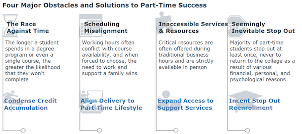 We identified a number of fantastic approaches that can be scaled. First, credit accumulation can be condensed through accelerated coursework or staggered course starts. Second, course delivery can be aligned to the lives of part-time students by offering block schedules and more weekend classes. Third, part-time students should have comparable access to services as full-time students. This may require virtual services or bringing support staff to students on campus.