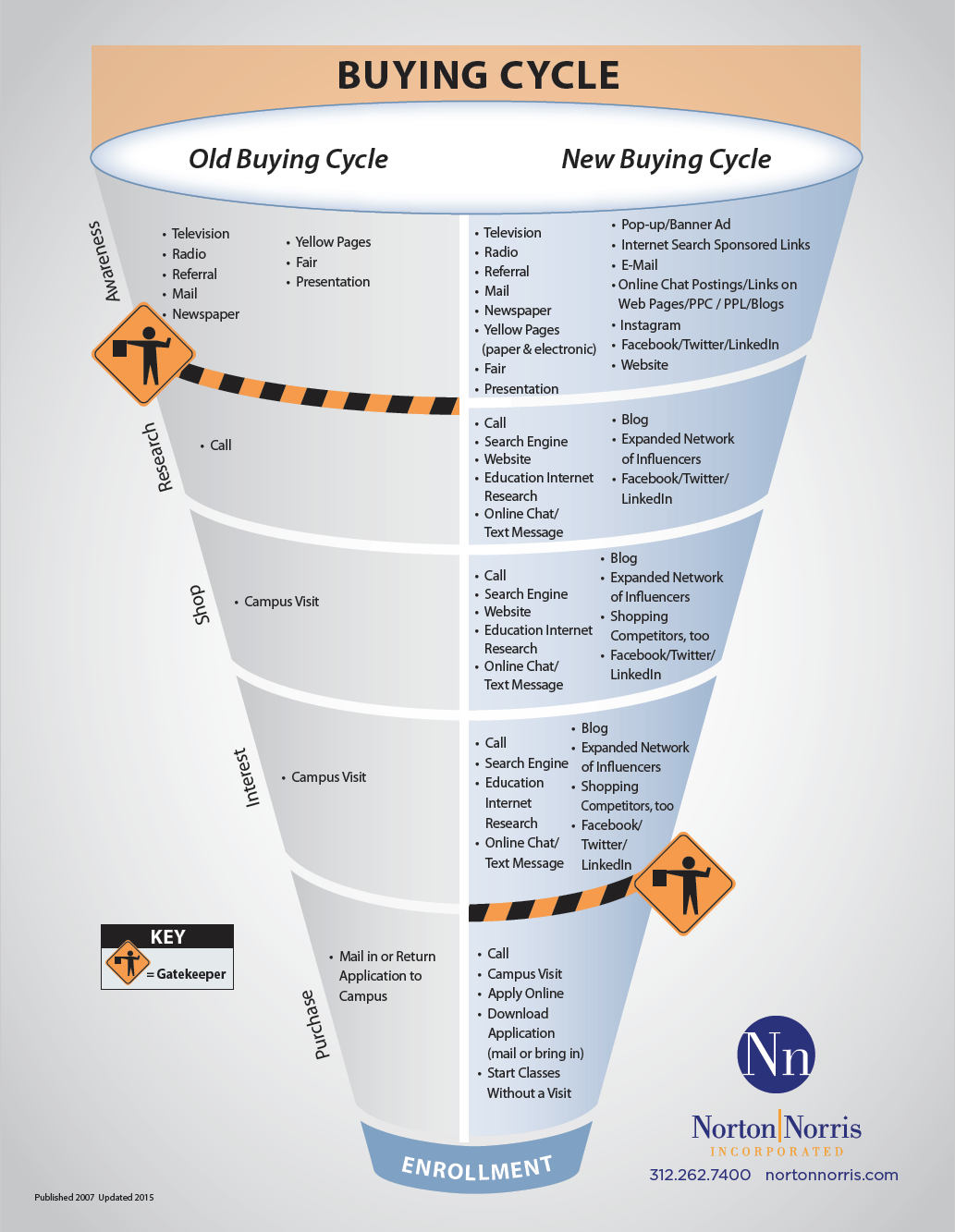 It’s essential for leaders of any organization to be aware of the consumer experience if they want to create value and improve results. Let’s face it, today’s consumer can move through the buying cycle without ever speaking with a person. This has interesting implications for the enrollment funnel, which was created before the invention of the Internet and mobile devices (see Buying Cycle Diagram 1).