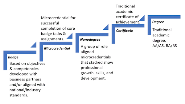 Given this, community colleges can leverage their offerings to create learning opportunities that align with job development goals. They can develop new pathways for their existing credentials by creating smaller microcredentials that could accumulate into broader academic earnings. This “learning ladder” would include a credit model where smaller modules, such as badges, would have a credit equivalency that could be collected and leveraged as a microcredential that could be added to a nanodegree.