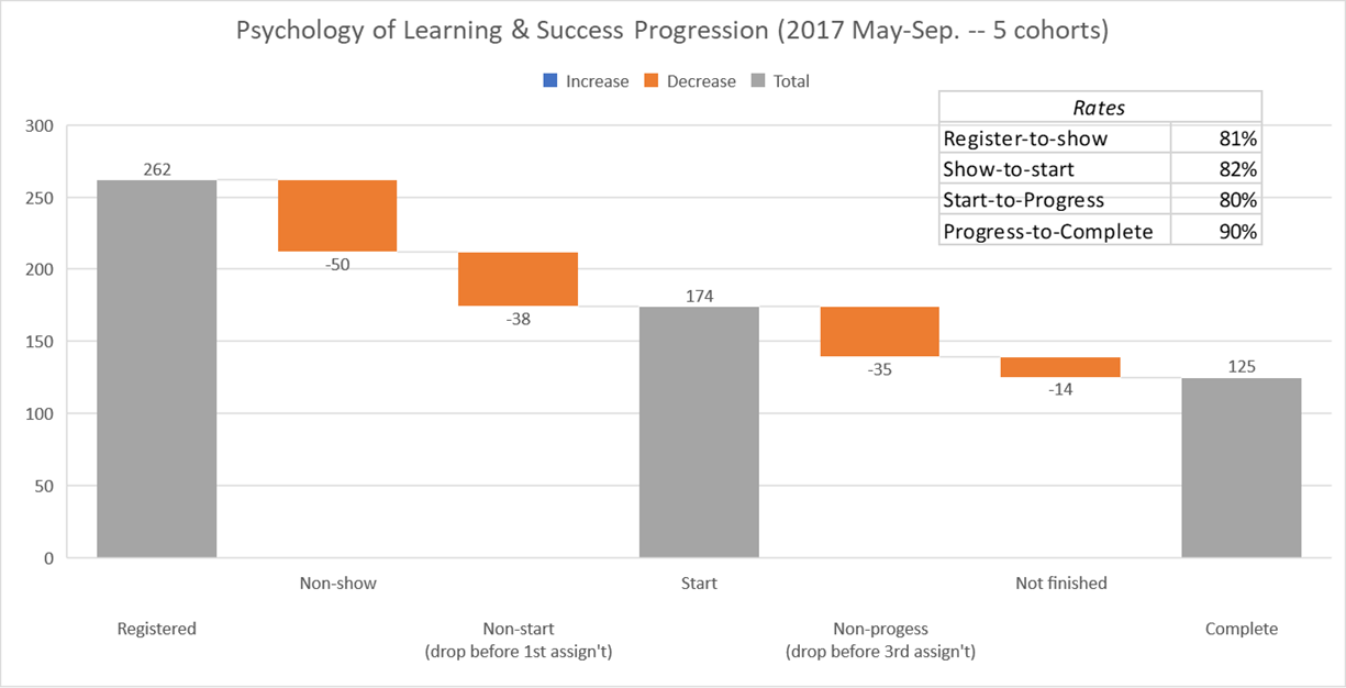 Over 90 percent of students who desire to pass Psychology of Learning and Success will build their learner performance to a collegiate level (Profile of a Quality Collegiate Learner) and pass the course, while 34 percent of students registering will self-select that they aren’t willing to do what it takes to become college ready.