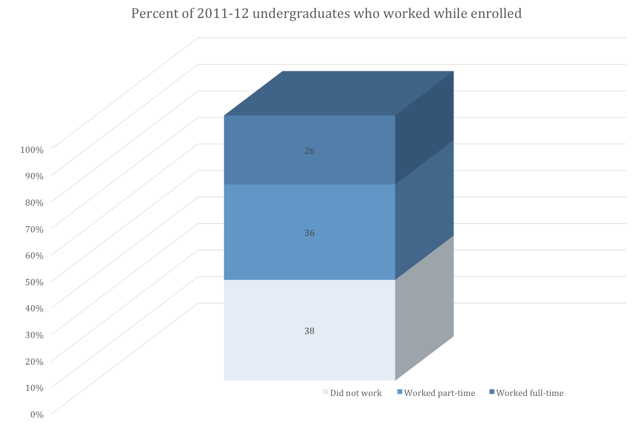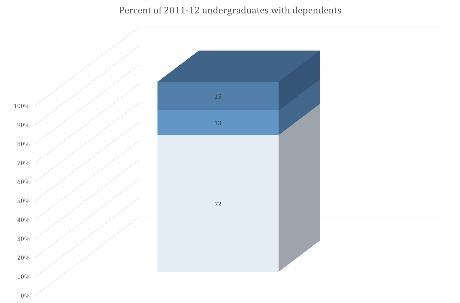 As our figure shows, over a quarter of all 2011–12 undergraduates were taking care of dependents, and over a quarter were working 35 or more hours a week while in school.