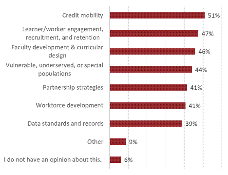 By helping diverse organizations find common cause in adult learners and workers, we can keep education and training providers aligned with workforce needs in real time, sustain healthy talent pipelines and support enrollment in education and training programs, from badges and microcredentials to certificates and advanced degrees. To see that common cause, we don’t have to look any further than some of our earliest survey questions. One of the primary concerns of our postsecondary education members is increasing adult learner enrollment. And the top concern of our workforce/economic development members is designing career pathways/occupational bridges.