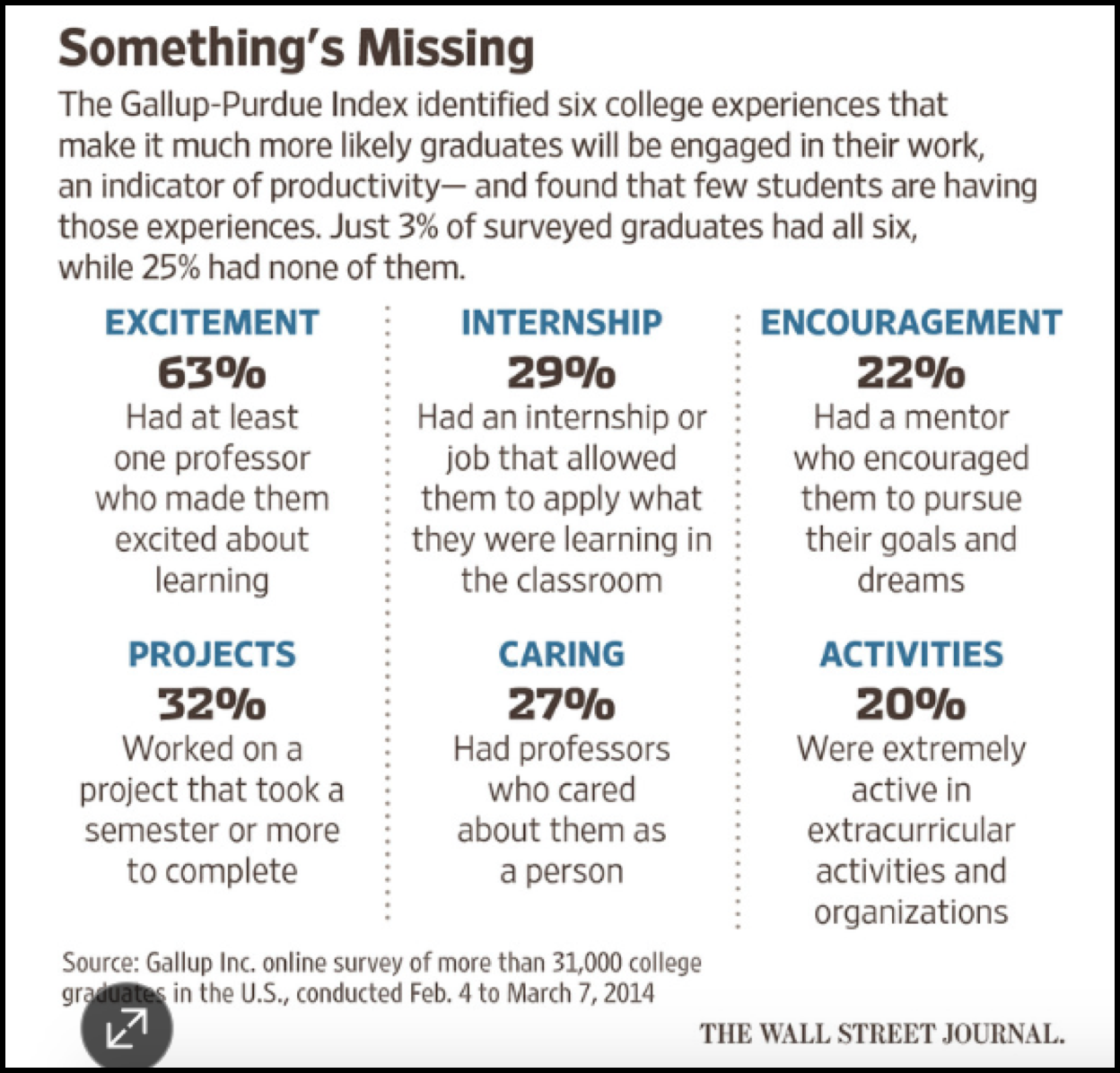 Sure, we say we connect the dots, as evidenced by a recent Gallup report showing that the purpose or mission statements of the more than 50 higher education institutions that participated in this study shared “striking similarities, regardless of institution size, public or private status, land-grant status or religious affiliation, or for-profit or not-for-profit status.” Examples: “We prepare the leaders of tomorrow,” “We nurture lifelong learners” or “We aim to have a global impact, while serving our local community.”