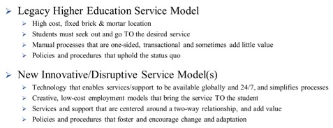 These findings helped the university come to a new realization: with no adaptations, traditional campus service structures do not work for online students. In the traditional campus service model the student goes TO the desired service. In the online education service model (and now finding the same expectation and need on traditional campuses) it is critical to flip the paradigm and bring the service TO the student (Figure 1).