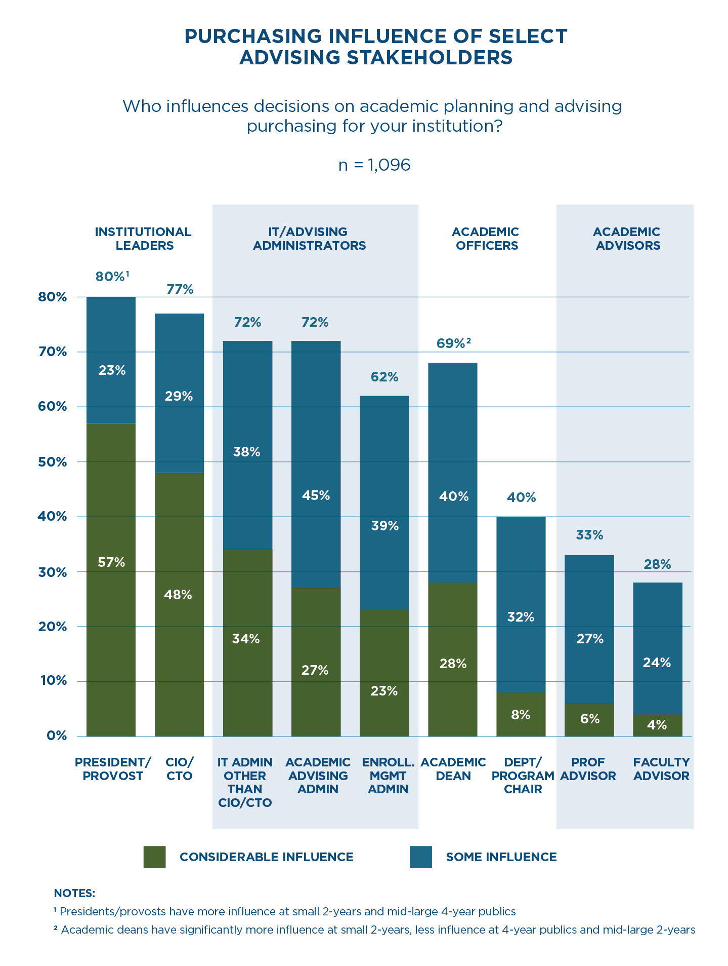The number of stakeholders around campus involved in ensuring students receive sufficient planning and advising support is growing, making efforts more holistic, but more complicated. The growing emphasis on student success as a top priority for institutions means presidents, provosts, as well as campus IT leaders are joining the advising department to drive change. One indicator of this trend is that advising purchasing decisions are no longer siloed in the advising department. According to our June report Driving toward a Degree: Establishing a Baseline on Integrated Approaches to Planning and Advising, respondents reported that several groups have at least some influence on planning and advising purchasing decisions, including institutional leaders and IT administrators, as well as advising administrators, academic officers, and advisors themselves.