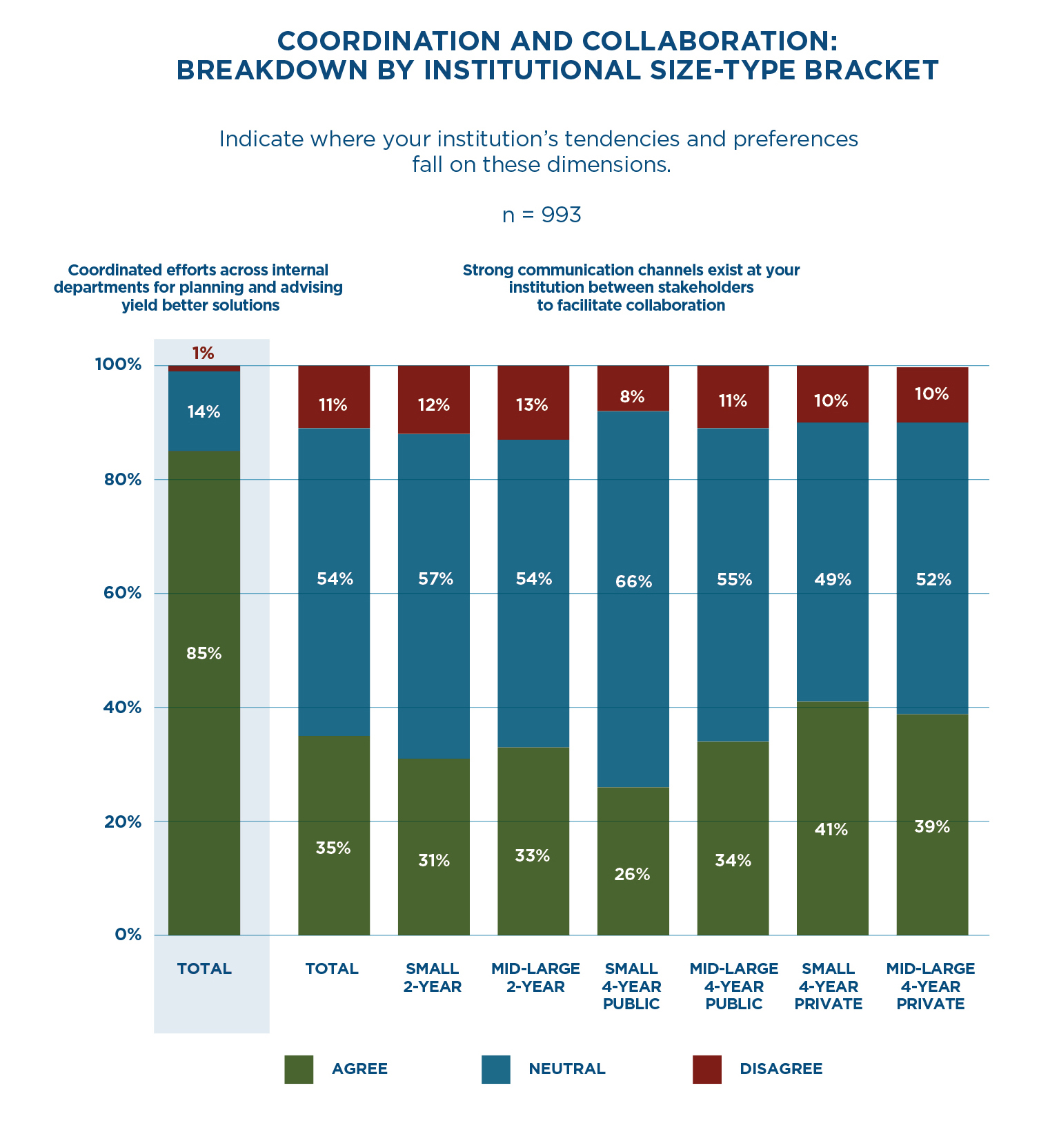 Despite this consensus, just 35 percent of stakeholders reported strong communication channels exist at their institution to facilitate this kind of collaboration. While private institutions and, ironically, larger institutions (enrollment of 20,000+) reported slightly stronger coordination on student success, no segment of higher education exhibits this ability resoundingly.