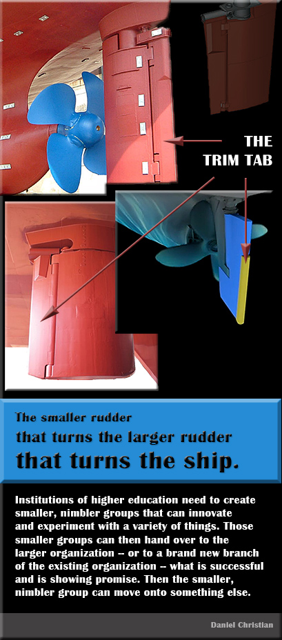By forming Trim Tab Groups throughout higher education, we gain the capacity to experiment with relatively small projects that will ultimately have much larger impacts on the institutions and the learners that those institutions serve. The tricky things here are that: