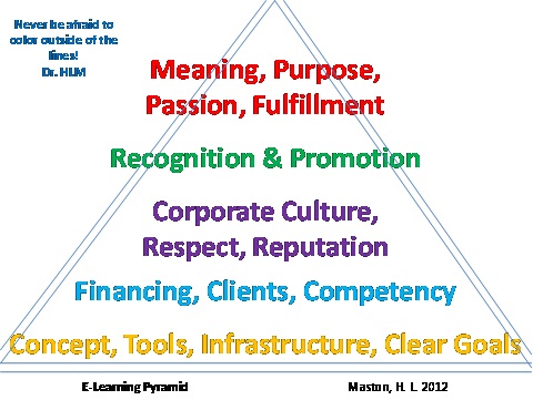 5. Acceptance Initial response: Well this isn’t working. What happens here is another meeting… but this time the meeting is based on a universal realization by all parties involved that the status quo isn’t doing anything for anybody. What also happens here is the understanding (hopefully) that to continue to feed, support, and defend the current way things are environment will lead no one anywhere. Individual opinions and wants become transformed into group collaboration with a clear set of needs on the horizon. It’s time to stop reacting to the failure and time to start planning success! Action: Back to “The Plan”. I’ve made it simple for you. The plan you can use is the e-Learning Pyramid. It’s all there. Pull it up, lay it out, work with it and watch your organization thrive! Happily and with all components aligned to steadily support the actions and beliefs of technology implementation in the e-Learning environment.