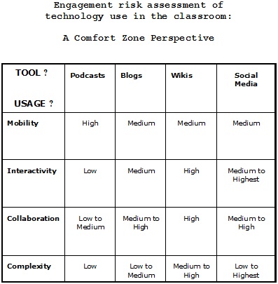 I find it interesting that the institutions of higher learning seem to have the greatest risk perception of purposefully utilizing the tools in the classroom. This leads to the question of why is there a hesitation to implement these tools into the classroom where the Immigrants are being taught to teach the Natives? It appears that the gap between the communication technologies which are under-utilized for content distribution in the classroom and the students of the next generation who are actively engaged in these technologies is growing wider. My research indicates that there is an overwhelming component of hesitation brought alive by the perceived roadblocks associated with risk.