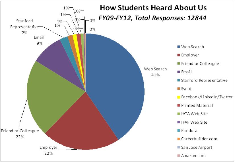 We began by assessing how enrolled students had heard about SCPD based on various existing marketing activities to establish benchmark data (Figure 1, above. For a more detailed look at the variable success of our marketing initiatives, please click here). We measured channels where the majority of our marketing spending was focused, such as email, employer communication, printed materials, presentations by Stanford representatives, web search, events (such as company information sessions), social networking, and friend or colleague recommendations. This became an important baseline evaluation tool for existing channels, which we continue to measure today.