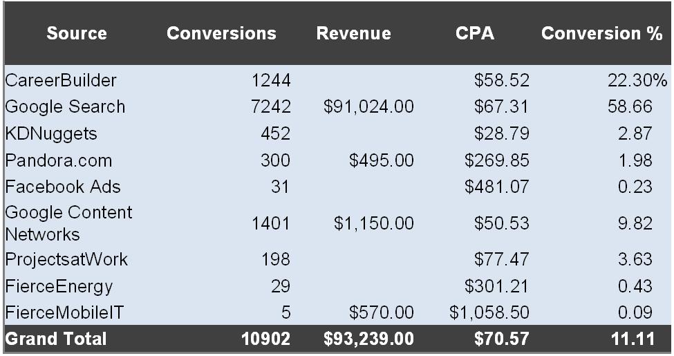 To extract relevant data, the SCPD created a team affectionately known as the Data Crunchers in 2009 to manage the overall data capture and extraction. Their charge for marketing is to evaluate each marketing channel’s overall effectiveness, from first contact to registered student. While easy to articulate, achieving this objective took quite a bit of effort. Historically, the SCPD has relied on a variety of marketing tactics to attract its student population. Measuring the return on investment of every marketing channel has now become an important part of SCPD’s investment strategy. We developed a simple internal statement to guide the marketing team: “If you can’t measure it, you can’t do it.”