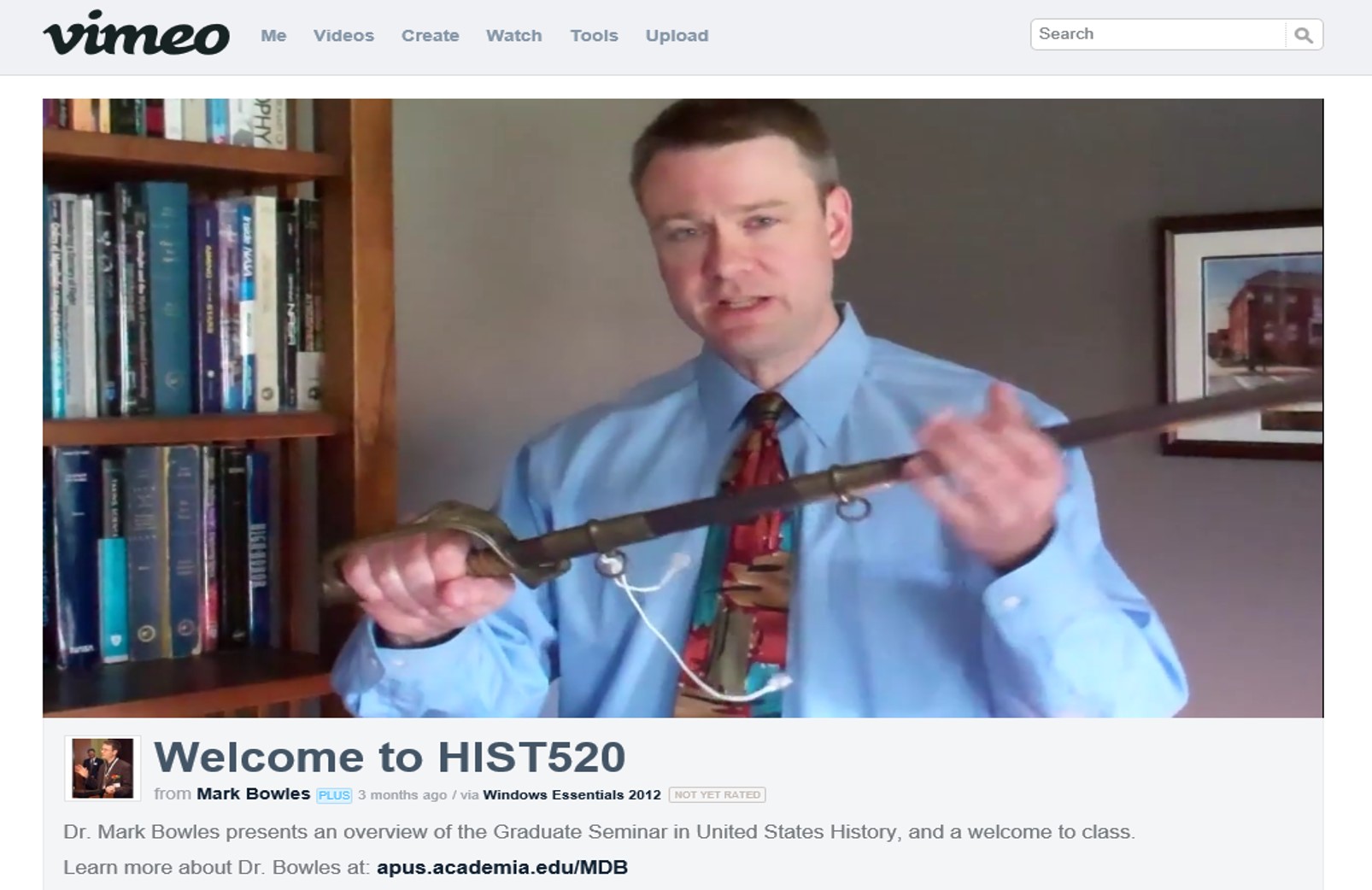 I create other videos to specifically welcome students to individual classes. This lets me bring the syllabus to life and discuss specific goals for the course, as well as entice them with my Civil War sword from my great-great-great grandfather.