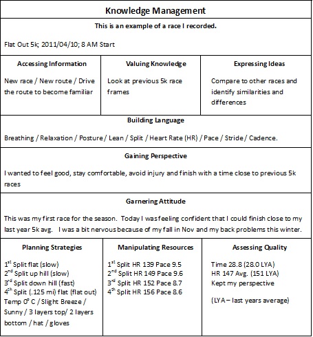 There is no other way to provide an example for building knowledge than to get a little personal. I am a runner. I started running seriously about ten years ago after I retired. My personal knowledge system has incorporated hundreds of runs over the past ten years. Running is very much a science. I believe that it is the ultimate knowledge building experience because it incorporates almost every aspect of the body energy system. And no matter how long you run, there is always something new to learn.