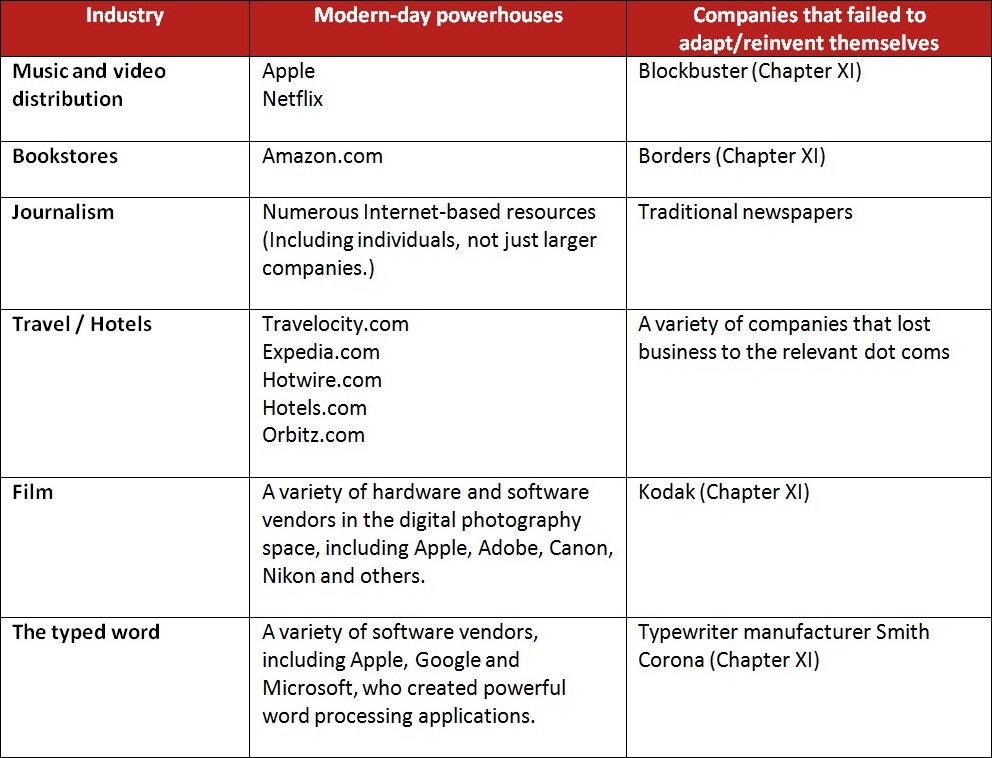 Consider the following industries and the (relatively speaking) nascent companies that are now modern-day powerhouses; consider also those companies that failed to change, adapt and reinvent themselves: