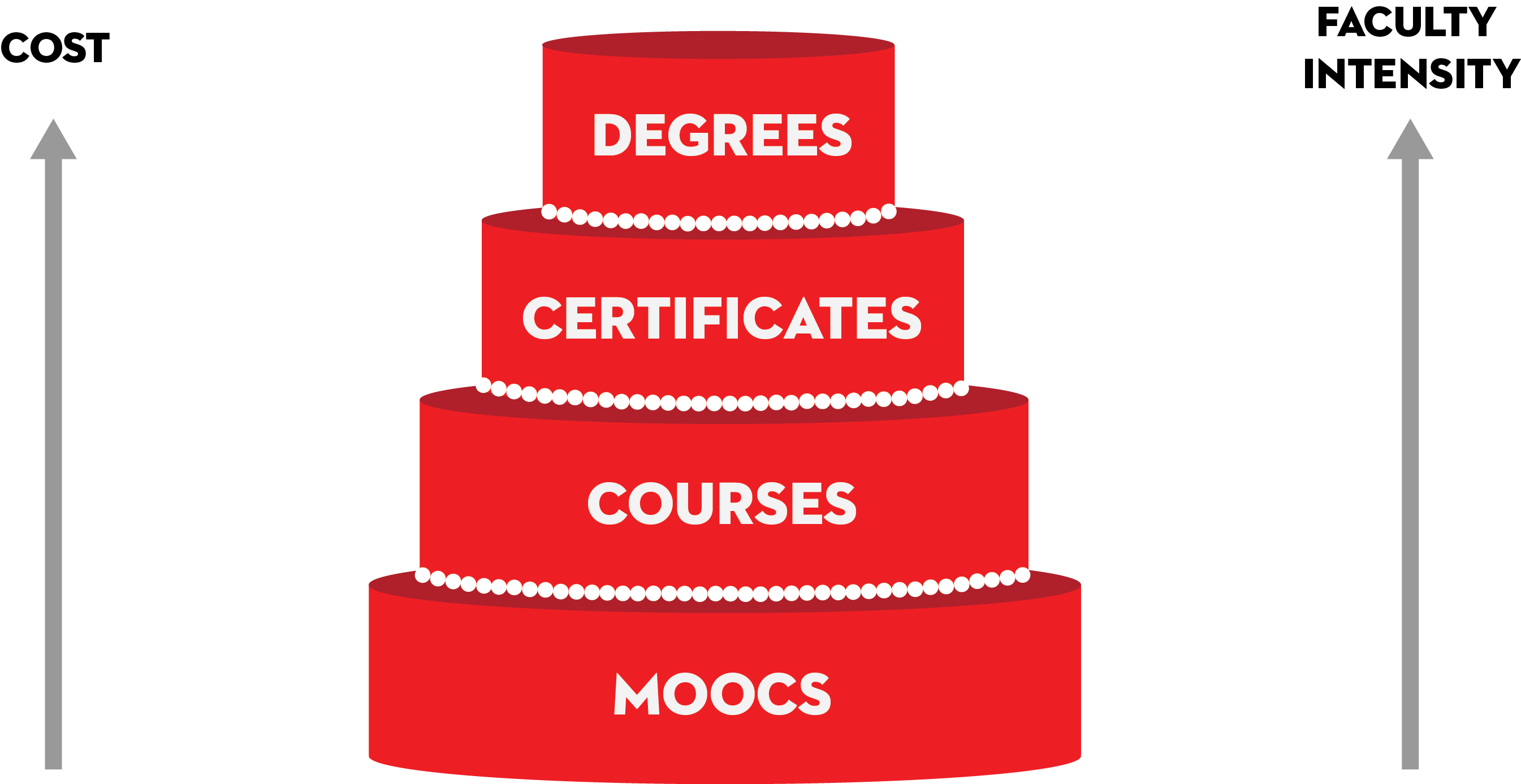 In 2012, after teaching more than 75,000 students online, we became a partner institution with both Coursera and edX. This added a new bottom layer to our wedding cake of options: MOOCs.