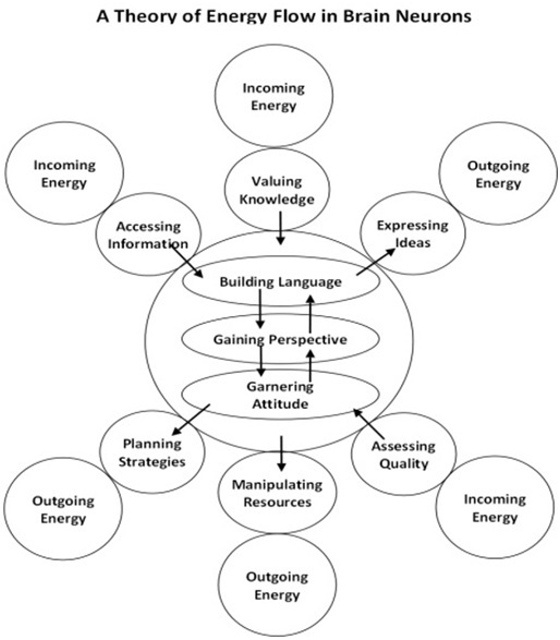 The human brain is made up of networks of hundreds of billions of interneurons. Those networks process the knowledge energy of our minds. The human brain is both simple and complex. The lowest common denominator of knowledge happens as the function of a single brain neuron or interneuron. All interneurons function similarly. They take in energy, process it, store it and release it. In the diagram I have equated this energy action to the nine element learning process. What I am saying is that each brain neuron is similar to a mini computer. Imagine hundreds of billions of computers connected and interconnected and automatically influencing each other and you have the complexity of human knowledge.