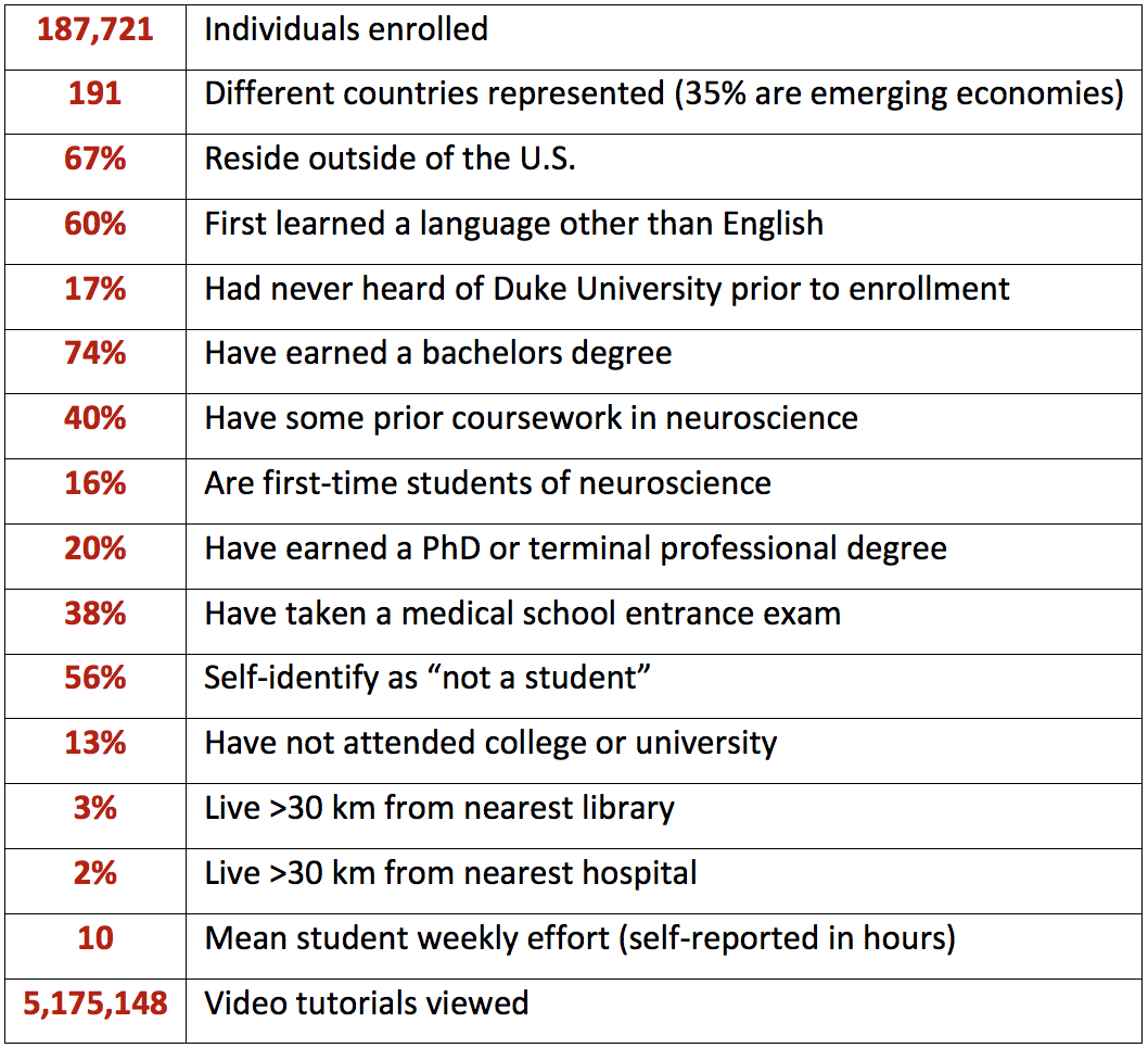 As my students have attested in forum posts and external blogs, Medical Neuroscience is a serious course. In fact, it has long been the toughest MOOC in the Coursera catalog, as reflected by the depth and breadth of instruction, the expected weekly workload (16-20 hours), and the duration of the course (12 weeks). Despite these challenges, or perhaps because of them, over 100,000 individuals from all walks of life and all corners of the globe have engaged content across three runs of this course and one run of a shorter derivative course (Foundational Neuroscience for Perception and Action). The table below provides a profile of the experience to date.