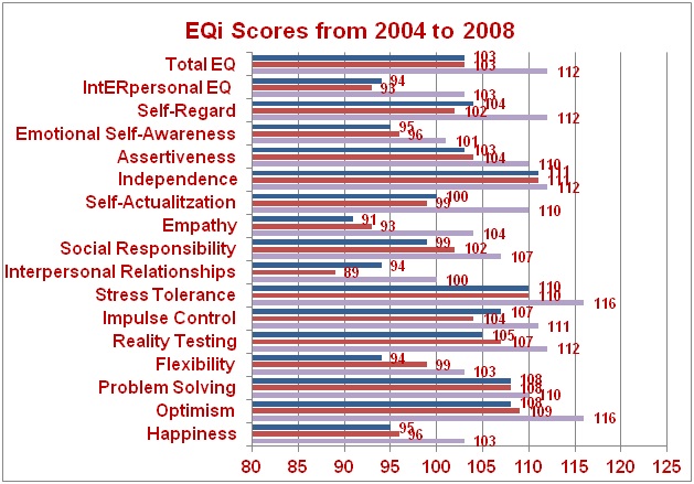 After the yearlong course where they received coaching and follow-up, they were given a second EQi at the end of the course. The difference is astounding! There are major shifts in behavior (any increase greater than 5 points) as indicated by the shifts in the numbers. In the beginning, 11 out of 17 competencies were below the mean (100). Now, 16 out of 17 competencies are above the mean! This group has made major, lasting improvements.