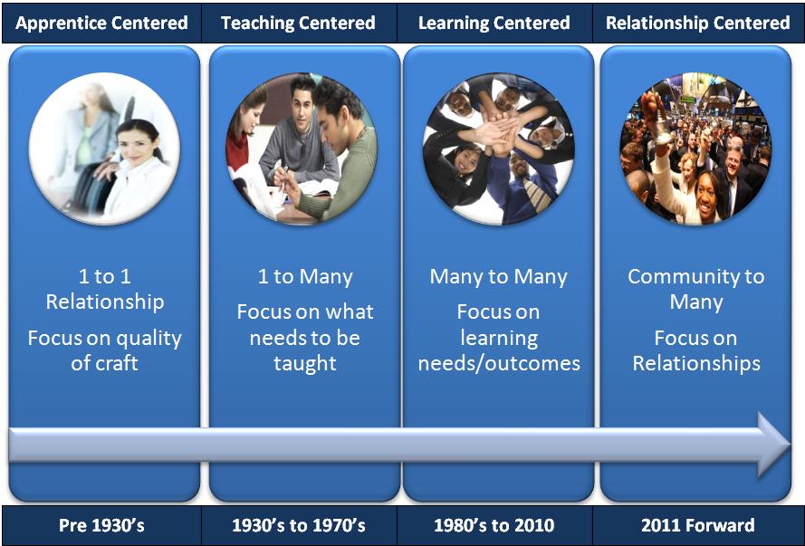 Another component that is contributing to the movement toward lifelong learning plans is the shifts in learning context and relationships of scale. Much like using LinkedIn or Google when you need information related to your learning cooperated by a friend or colleague. This too will be an adjustment for traditional leaders and managers still struggling with a post WWII command and control organization. As the table below shows, learning shifts with different contexts and relationships.