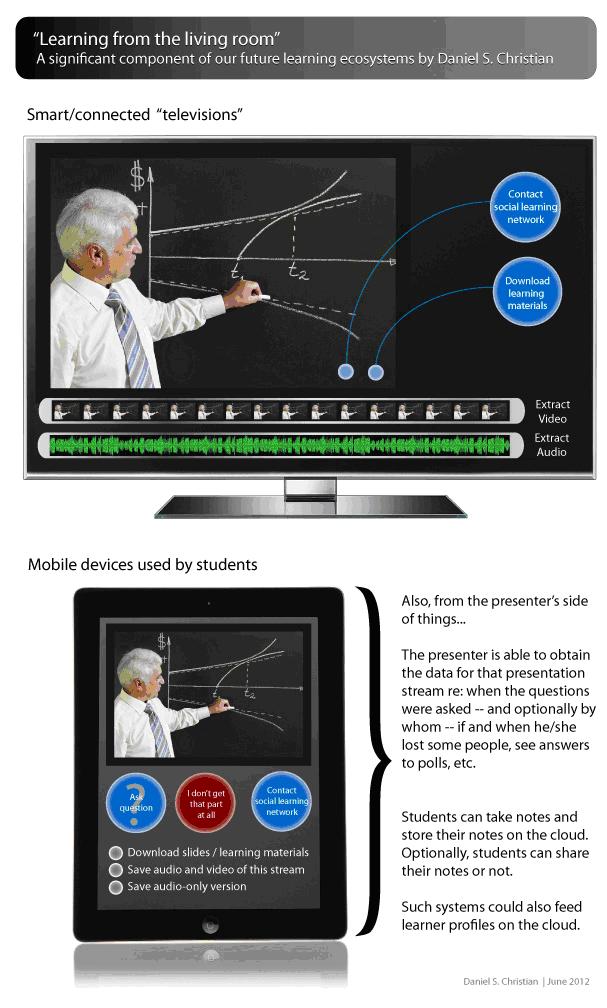 A: I created a couple of graphics along these lines that attempt to capture a potential vision here. I call it “Learning from the Living [Class] Room,” and it continues to develop in front of our eyes. We could be watching a “lecture” on a big screen and simultaneously interacting with people throughout the world on our smaller screens.