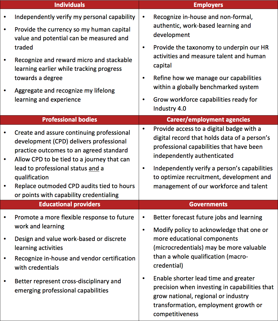 What credentials offer is a solution to the much hyped problems surrounding the ways in which disruptive changes will profoundly impact the employment landscape and world of work. Professional Practice Credentials offer an effective mechanism to improve educational offerings and employee engagement, build workforce capabilities and increase productivity and competitiveness in this turbulent environment.