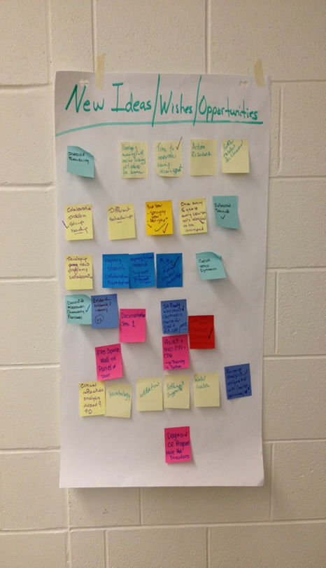 As in most situations, improved communication, clarity of purpose and transparency in the process helped shift perceptions from compliance to alliance. This transformation was further enhanced by creative problem solving and design thinking, deliberate empathetic perspective, democratic tools, positive language and facilitation style. Dialogic sessions with solution finding prompts such as “How might we” and “What are all the ways. . .”, in addition to the simple inclusion of the almighty Post-it Note, encouraged inclusion and a synergy of ideas. A pedagogy of inclusion and compassion was outlined at the beginning of a session establishing an environment of partnership and alliance in quality education and played a significant role shifting stakeholder tenor and attitude.