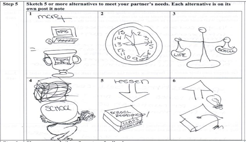 An interesting development in the experiment occurred with post-graduate students at a Canadian university. Unlike the college stakeholder sessions, this group struggled with identifying strengths, challenges, new thinking and future directions. They wanted the program to change, yet the data they were producing dealt with cursory alterations. We shifted our process to design thinking’s question framing, empathetic one-on-one interviewing, point of view statements and storyboard iterations. When invited to use visual representations of post-grad needs and concerns, their drawings showed an authentic and consistent story of struggling to balance school, work and life (Image 7) that had not been identified previously. Having been in their shoes decades before, I could empathize with their reluctance to admit this, especially since the majority of them were females. These drawings then empowered us to revisit the data previously collected and to understand it at a level that encouraged meaningful solutions.