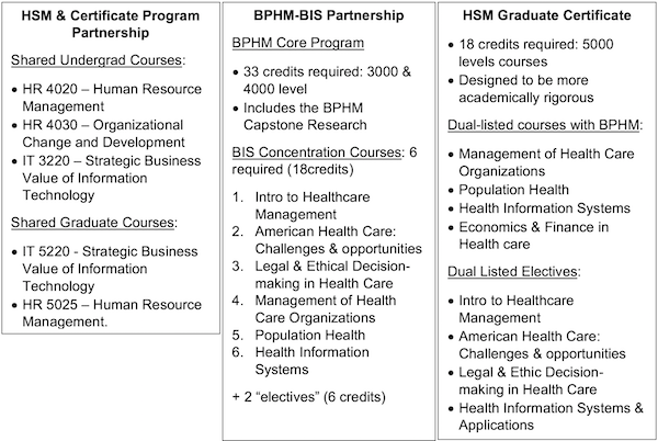 Since the BPHM program’s launch in 2015, we developed and launched the Graduate Certificate in Health Sciences Management (HSM) in 2016 for individuals who already held a minimum of a bachelor’s degree, but needed to be upskilled with a curriculum providing them the requisite knowledge, skills, and competencies in healthcare management to prepare them as entry-level healthcare managers. Intra-departmentally, we developed “dual-listed” courses at the graduate level to align with the undergraduate level courses in the BPHM program. The graduate level courses, however, are more academically rigorous, with higher-level learning objectives, assignments and discussion forum topics. Undergraduate students in allied health within the BPHM program benefited from the diverse perspectives and experiences of the graduate students interested in healthcare management, but entering from diverse fields such as marketing, nursing, finance and education.