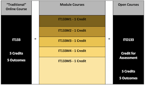 The content in our traditional courses is organized around outcomes: one outcome for each credit. In parallel, we have created single-credit course modules aligned to our traditional courses. These one-credit modules have the same content and outcomes they would have if organized in a traditional course. All assessments for a particular outcome are identical, regardless of instructor or course type, enabling maximum flexibility of course delivery.