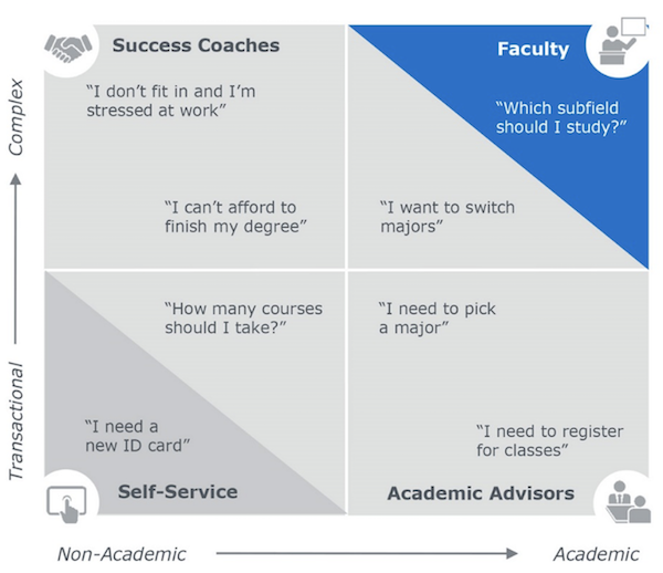 The EAB nicely illustrates those university and college representatives who can, and should, contribute to the holistic success of students: students themselves, academic advisors, success coaches, and faculty. Academic advisors typically engage in transactional relationships focused on academic matters; faculty engage with students, again, along academic lines, but in more directed ways, especially as the experts in the fields and areas of study which the students are pursuing; and success coaches often develop more complex relationships with the students related to non-academic issues. This holistic approach, especially for online students, can provide multi-layered support, making the students feel more connected and engaged throughout their academic journey. Further, this approach allows for better tracking and monitoring of the students’ progress, reducing the chance of them falling through the cracks.