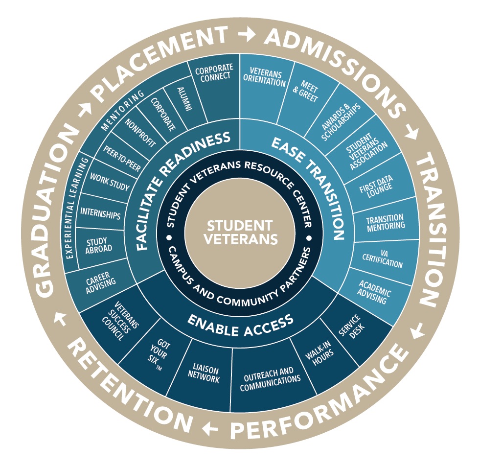 Armed with the eight keys, the ACE Toolkit, best-practice data from regional schools with top-rated veterans programs (like Florida State University and the University of South Florida) and a desire to create a positive learning environment at UGA for our veterans, in Fall 2013 the Office of the Dean of Students created a Student Veterans Resource Center (SVRC). Today, the SVRC serves at the nexus of UGA’s approach to serving student veterans. The essence of our approach is captured and communicated through a holistic model.