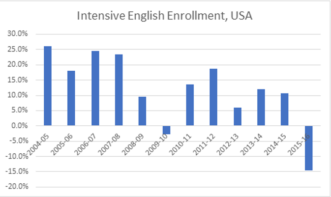 Many IEPs were heavily reliant on Saudi and Brazilian students, as well as Chinese students, and were hit hard in 2015 and 2016 as the number of intensive English students dropped drastically.