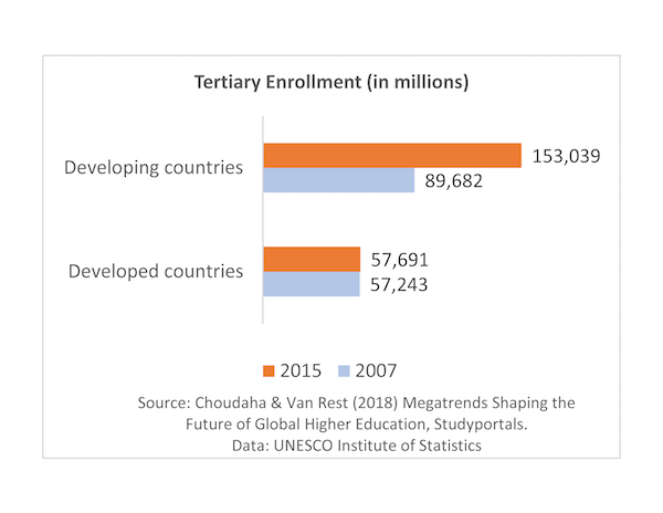 The report analyzed tertiary enrollment data of the recent years and noted that much of the growth was driven by “Developing Countries” as defined by the United Nations’ Millennium Development Indicators.