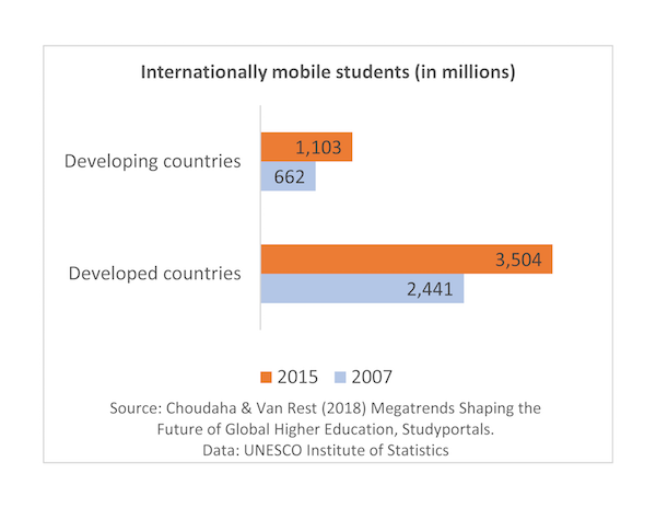 Between 2007 and 2015, the number of internationally mobile students headed to developed countries increased by 1.06 million or 44 percent. In contrast, developing countries added just over 440,000 international students or 67 percent on a much smaller base. Of total 4.6 million internationally mobile students in 2015, developed countries attracted three-quarters of all students.