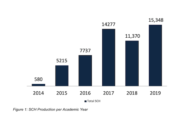 Figure 1 shows semester credit hour (SCH) production of students enrolled in the program each academic year since inception. Beginning with 580 SCH in year one (2014), the program has expanded to fifteen, 348 SCH at the end of 2019, the program’s sixth year of operations. The significant growth in student enrollment generated a massive spike in SCH production in the first four years. The program experienced a slight decrease from academic year 2017 to 2018 largely due to two factors: