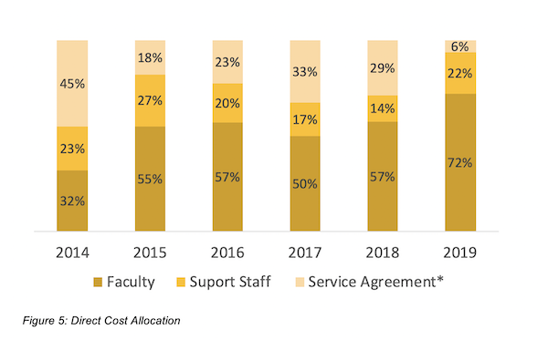Direct costs for the program primarily center on three major categories: faculty, support staff, and service agreements. Figure 5 shows direct cost allocation expressed in percentage of the total direct cost figures noted previously. Faculty cost allocation has continued to rise over time from 32 percent in 2014, to representing 72 percent of all direct costs by 2019. Currently, two professional-track faculty positions teach in the program and provide orientation sessions to new students.