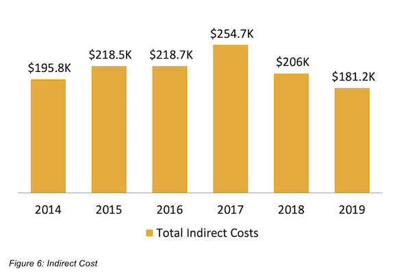 Figure 6 displays total indirect costs incurred by the program per each academic year since inception. Indirect costs began at $195.8 K during year one (2014) and have remained steady over time, actually decreasing to $181.2 K as of 2019. Indirect costs are expected to remain consistent over time as departments work together to standardize, automate and improve some of the manual intensive business processes related to the program’s overall operation which we will discuss more in detail in the following sections.