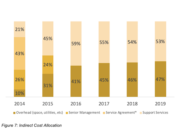 Indirect costs derive primarily from four major categories including the following: overhead, senior management, service agreements, and support services. Figure 7 shows indirect cost allocation expressed in percentage of the total indirect cost figures noted previously. Senior management involvement has reduced from 26 percent and 24 percent for 2014 and 2015. After the program was fully launched, this cost was excluded. In 2014, Service agreement costs were itemized as an indirect cost to the program, but as service agreement related expenses grew, these costs were fully transitioned as a direct cost to the program for the following years as detailed in the direct cost allocation section. Overhead, which only represented 10 percent the first year of operations, has increased to 47 percent as of 2019. University support services, which represented 21 percent for the first year, have grown to 53 percent by 2019, reflecting the largest indirect cost for the program, hence the importance of cross-departmental collaboration.