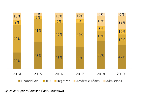The registrar’s office also accounts for support services: what was 6 percent of indirect cost at launch has gone up to 10 percent as the program continues to scale. The academic affairs division support of the program, across a variety of responsibilities, has also grown under new program leadership, and now represents 22 percent of indirect cost an increase from 13 percent in 2014.