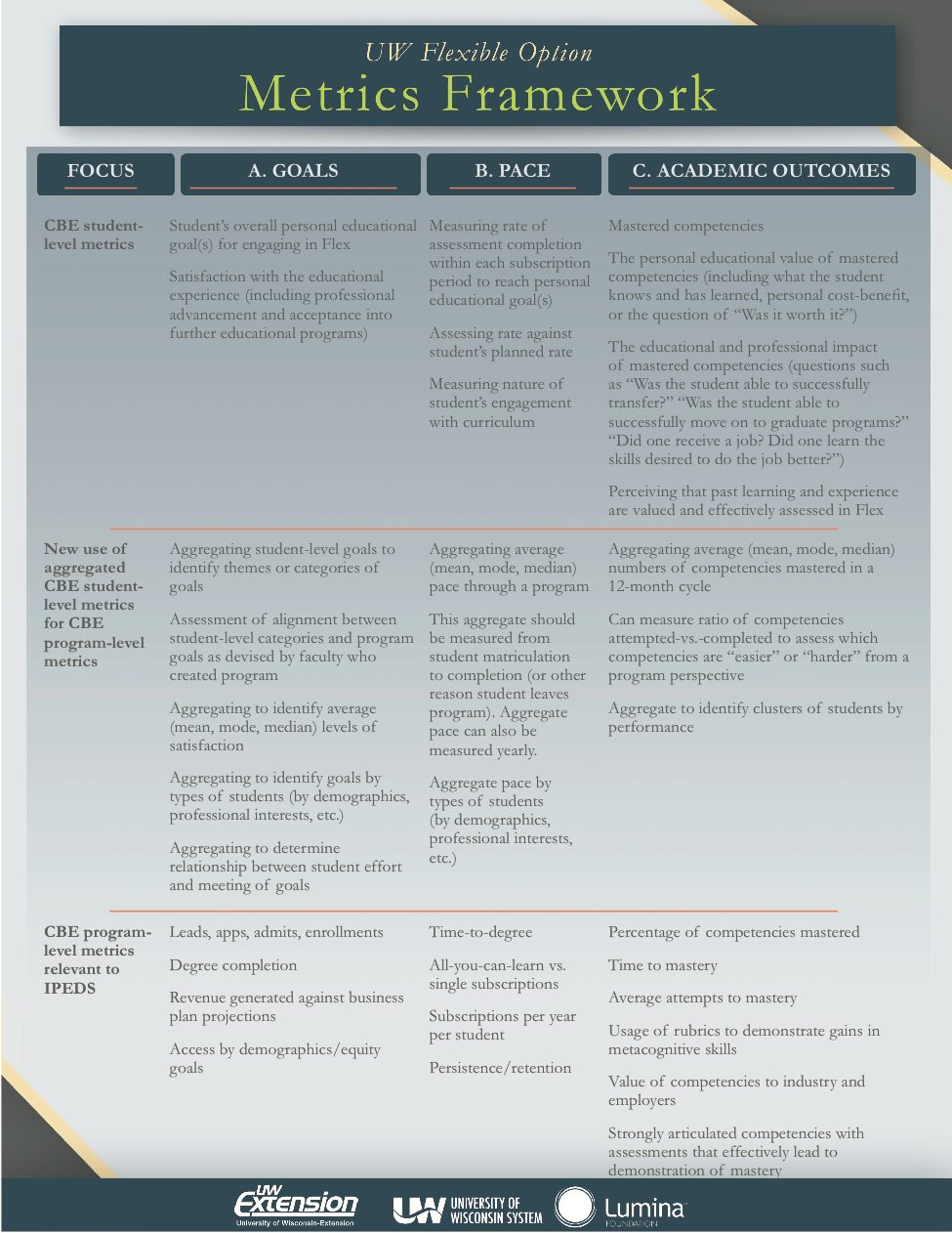 On the other hand, for CBE programs—and especially direct-assessment CBE programs such as the University of Wisconsin Flexible Option (UW Flex)—students only make progress when they demonstrate that they have achieved mastery over pre-determined skills, abilities and knowledge. This article will briefly describe the framework we are developing to measure student and program success. Some aspects of the UW Flex metrics framework are developed and in use while others are still in development. However, I will describe our full model in order to convey the intent and direction that is guiding our evaluation.