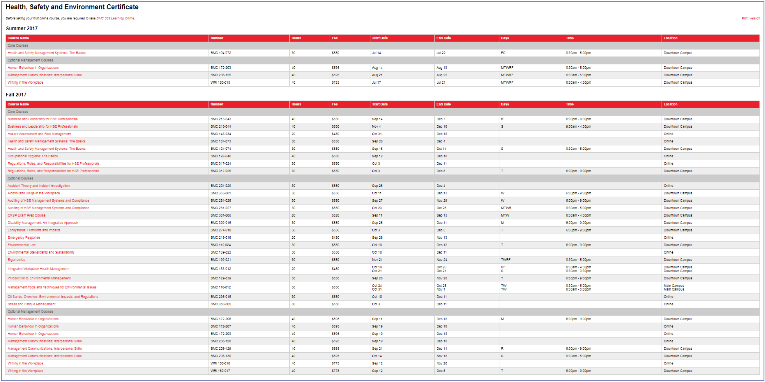To help students plan their certificate program education schedule, we have created a Certificate Timetable available on our Public View—viewable in the browser and with a Print Version option—so that in one screen, the student can see what courses they need to complete, when, where, and how the courses will be taught.