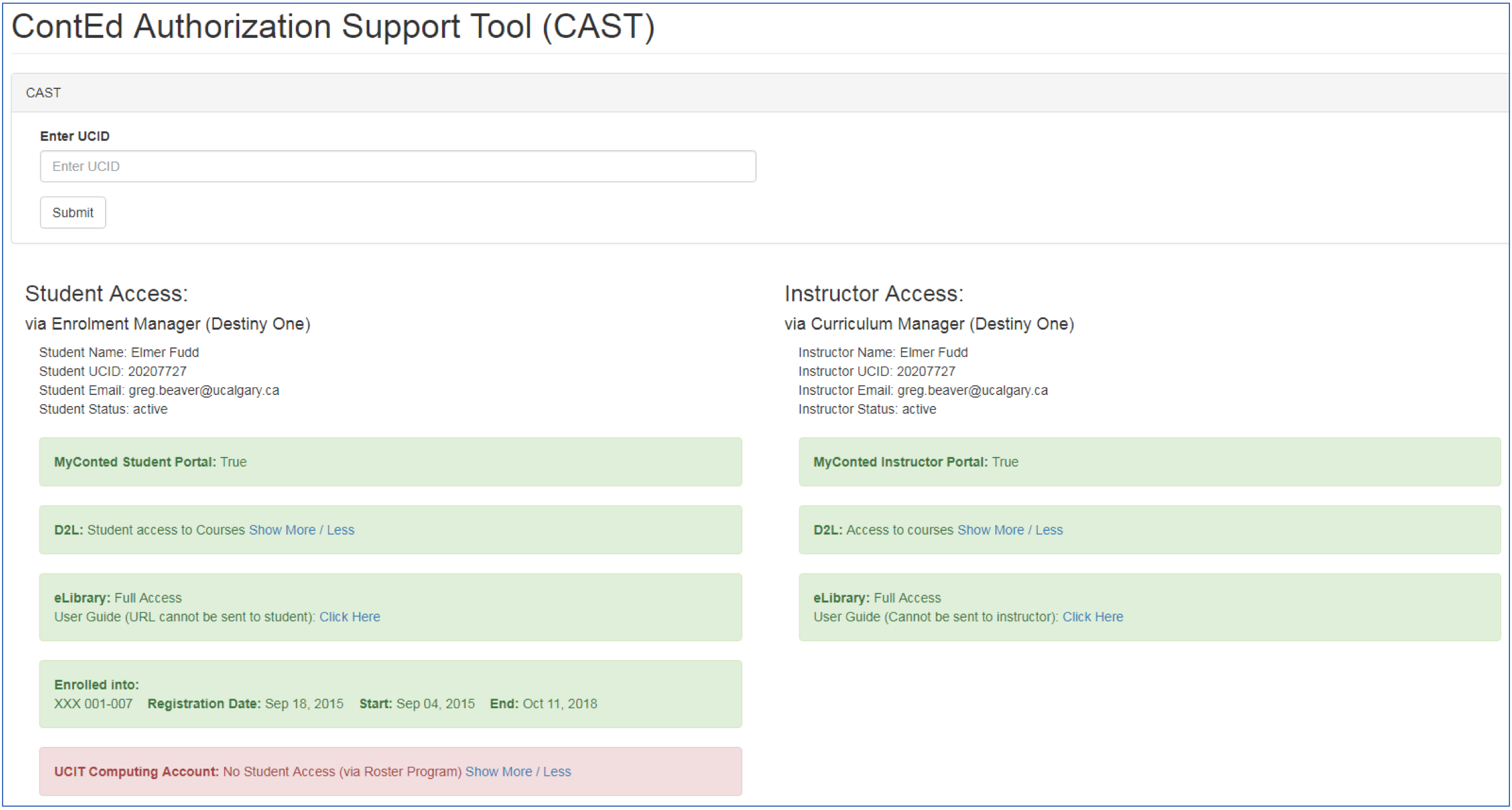 Our custom application, called CAST, helps us identify what the student/instructor has access to, and identifies any problem with their accounts. CAST makes it quicker and easier to answer inquiries and provide immediate assistance. Without CAST, gathering all of this information would require searches through several modules, and pages, as well as merging data sources that are not available in Destiny One, such as Office 365, eLibrary, etc., all within a single dashboard view.